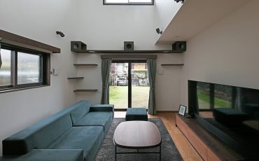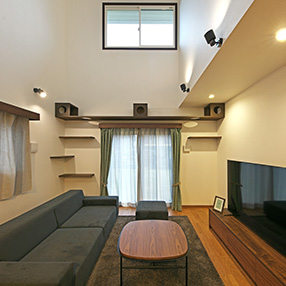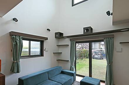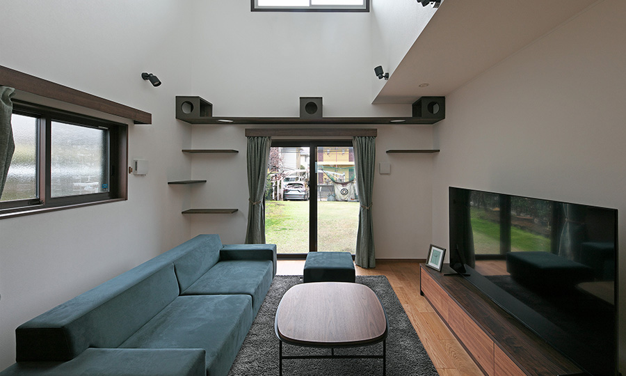 大きな吹き抜けからはたっぷりの自然光が降りそそぎ、リビングを一日中明るく心地よい場所にしています。ソファに腰かけて新聞を読むご主人、窓辺でコーヒーを楽しむ奥様、音楽を聴きながらリラックスするお子様――それぞれが自分の時間を楽しみながらも、不思議と同じ空間で過ごしたくなるのがこのリビングの魅力です。窓際やキャットウォークでのんびりくつろぐ猫ちゃんの姿も、家族にとって癒しそのもの。視界に映る自慢のお庭も、暮らしをより豊かなものにしています。
