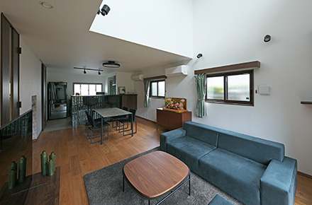 吹き抜けから降りそそぐ光と、落ち着いたグリーンのアクセントが調和するリビング。ご家族、そして猫ちゃんがともに過ごすこの住まいは、開放感と温もりに満ちた空間です。そこには、日常を快適にするための機能性と、家族の暮らしをより楽しく彩るデザインのこだわりがたくさん散りばめられています。リビングでの会話や食卓を囲む時間、猫ちゃんとの触れ合い――日々のワンシーンが心地よさに包まれる新しい住まいが誕生しました。