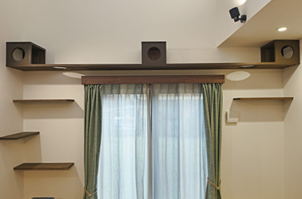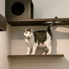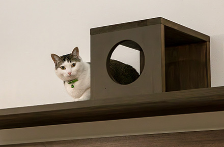 リビングの壁面に設けられたキャットウォークは、猫ちゃんにとってまさに夢の遊び場。高い場所を軽やかに移動したり、キャットボックスからひょっこり顔を出したりと、楽しげな姿は家族の会話のきっかけにもなっています。「今日はどこにいるのかな?」と見上げれば、そこにはのんびりとくつろぐ愛猫の姿。そんな光景が家族に笑顔をもたらします。さらにキャットウォークが空間のデザインとしても一役買い、空間に奥行きを与えています。人も猫も居心地よく、思わず長居したくなるようなリビングが完成しました。