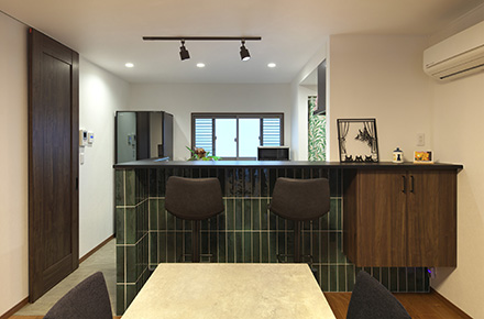 暮らしの中心となるリビングを、明るく開放的で、家族や猫ちゃんが自然と集まれる場所にしたい――そんな思いからリノベーションを決意されました。計画ではまず空間全体の印象を決めるカラーにこだわり、落ち着きと上質さを感じさせる「グリーン」をアクセントカラーとして採用。壁面やタイルだけでなく、家具もトータルで提案することで、色味に統一感を持たせた調和のとれた空間を実現しました。デザインと機能性の両方を大切にしながら、自分たちらしい心地よさを追求する住まいづくりとなりました。