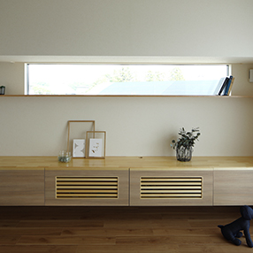 テレビまわりには造作収納を設け、見せる・しまうをバランスよく計画。生活感を抑えつつ、すっきりとしたリビング空間を保てるよう工夫されています。