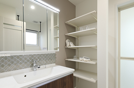 キッチン横の扉を出れば洗面脱衣所にもすぐアクセスできるので、水まわりの家事の流れがスムーズになり、日々の負担を軽減します。また、収納も各所にしっかりと確保されているため、生活感を抑えながらすっきりとした空間を保つことができます。朝の支度や帰宅後の片付けもスムーズに進み、家事と日常の動きが自然につながる、心地よい暮らしが実現しました。