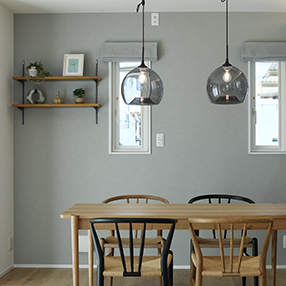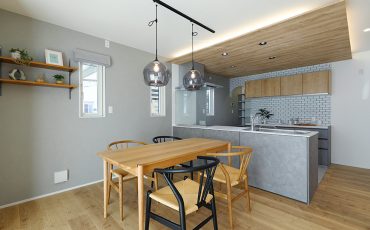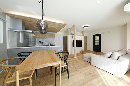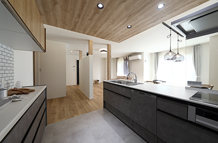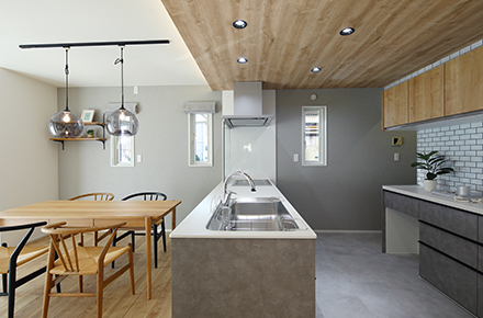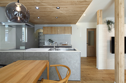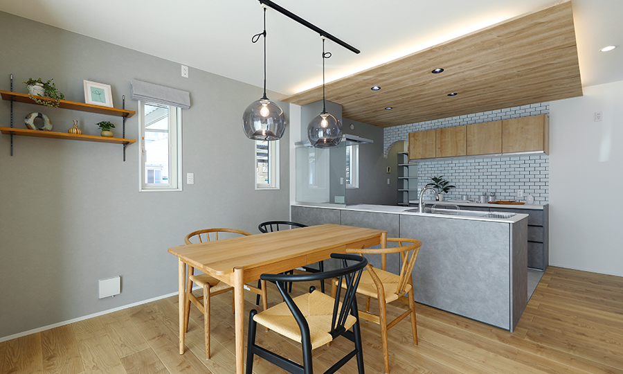 床や天井には木目を取り入れ、やさしい質感で空間全体を統一。キッチンはグレーの落ち着いたトーンでまとめ、ナチュラルな中にも程よいアクセントをプラスしています。間接照明とペンダントライトの組み合わせにより、キッチンは空間の“見せ場”としても印象的に。タイルや素材感を活かしたデザインが、日常の中にさりげない特別感を与えてくれます。