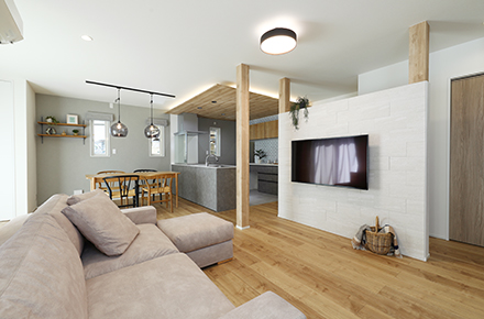 リビングは家族が自然と集まる場所だからこそ、過ごしやすさを大切に整えました。ソファでくつろいだり、ダイニングで会話を楽しんだりと、それぞれの過ごし方が無理なく共存できるレイアウトに。