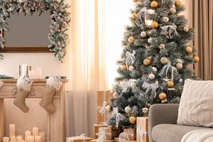 Beautiful Christmas tree in decorated living room. Festive interior