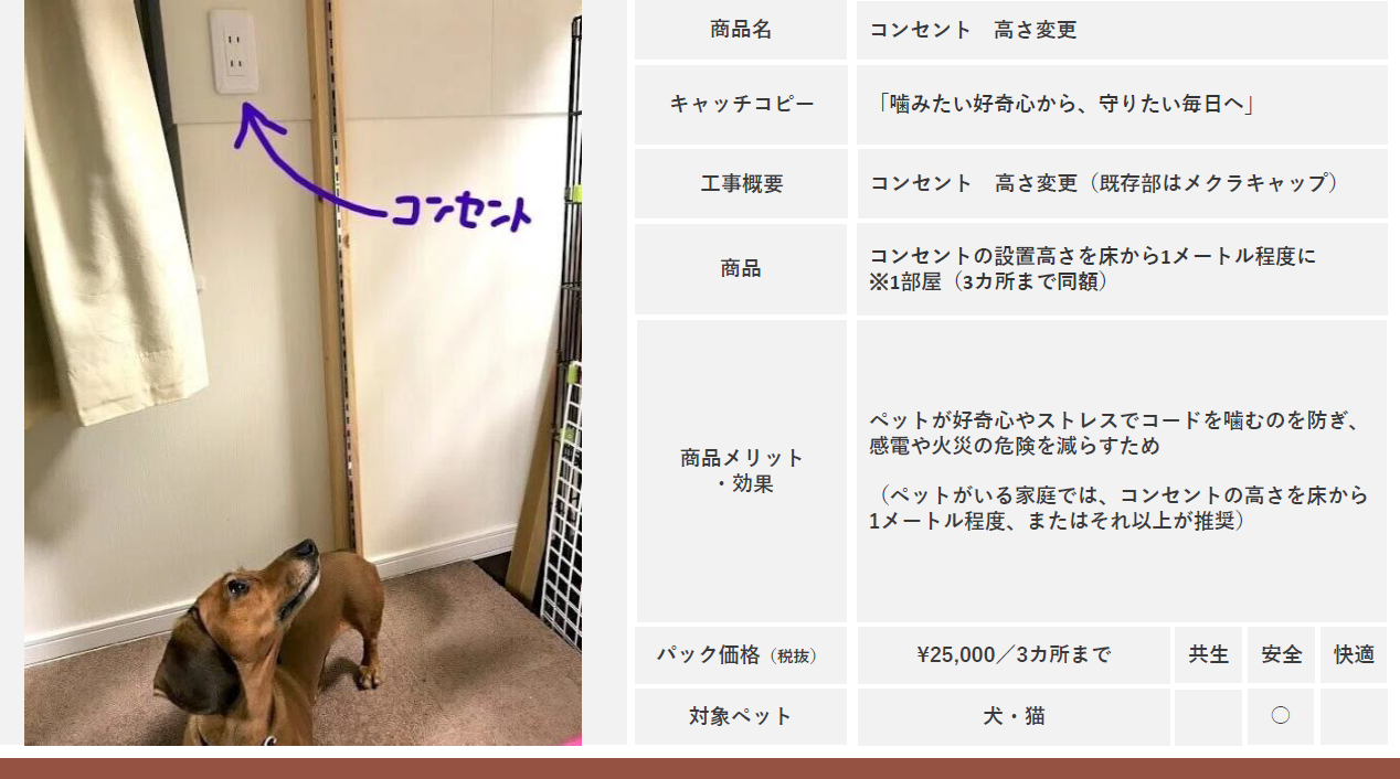 この事例だとわんちゃんやねこちゃんがコードをかじらないようにコンセントの位置を届かないところに移動させております。